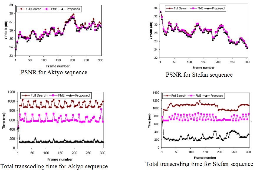 In this architecture the input MPEG-4 bitstream is decoded by MPEG-4 decoder. The transcoder decodes and encodes frame by frame. After decoding one frame, the frame data is transferred to H.264 encoder as input frame and the motion estimation is reused to reduce encoding time. Because the motion compensation module in H.264 encoder accounts 60-70% of total cost, reusing motion information from MPEG-4 decoder significantly reduces encode time.